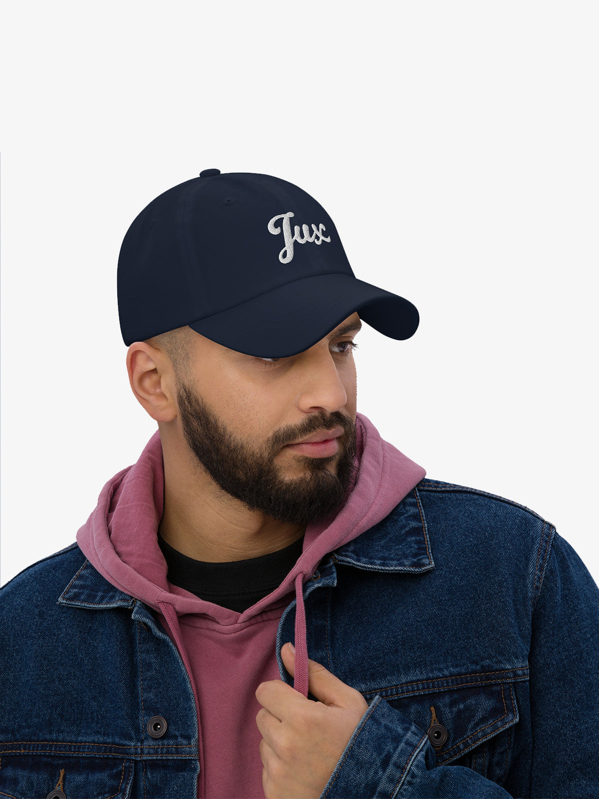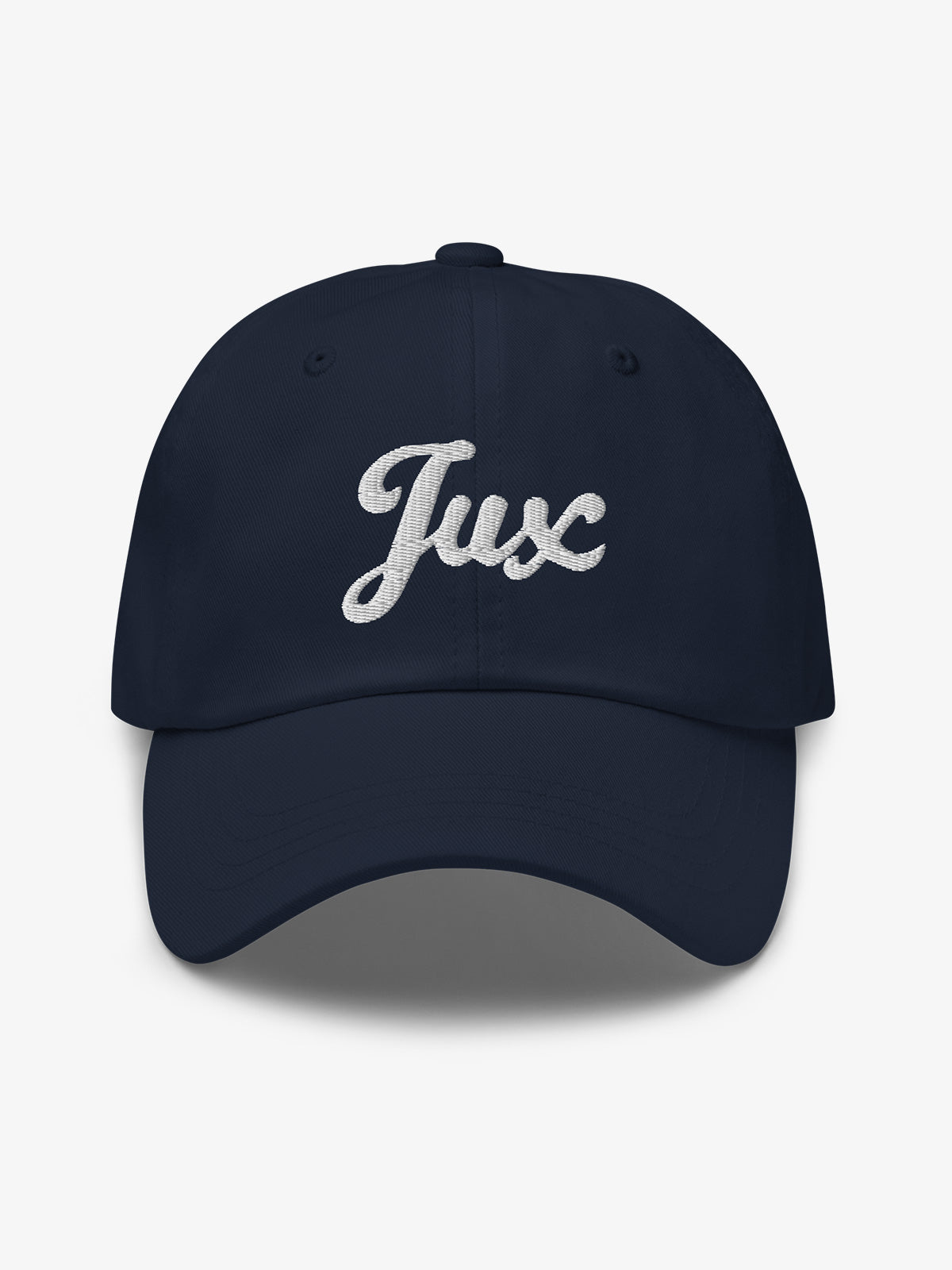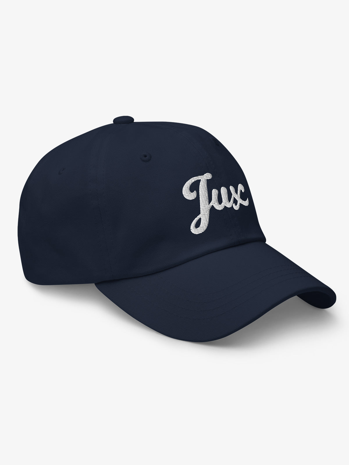 Classic "dad hat" style with unstructured, 6-panel form. Navy fabric with white, embroidered Jux "script" logo. Adjustable buckle strap in back. 100% chino cotton twill. One size.